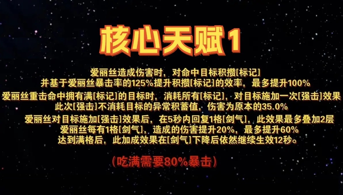 - 蓄力速度:至少兩條,以達(dá)到 100% 蓄力速度。蓄力速度越快,愛(ài)麗絲開(kāi)鏡后就能更快地打出滿蓄力傷害。