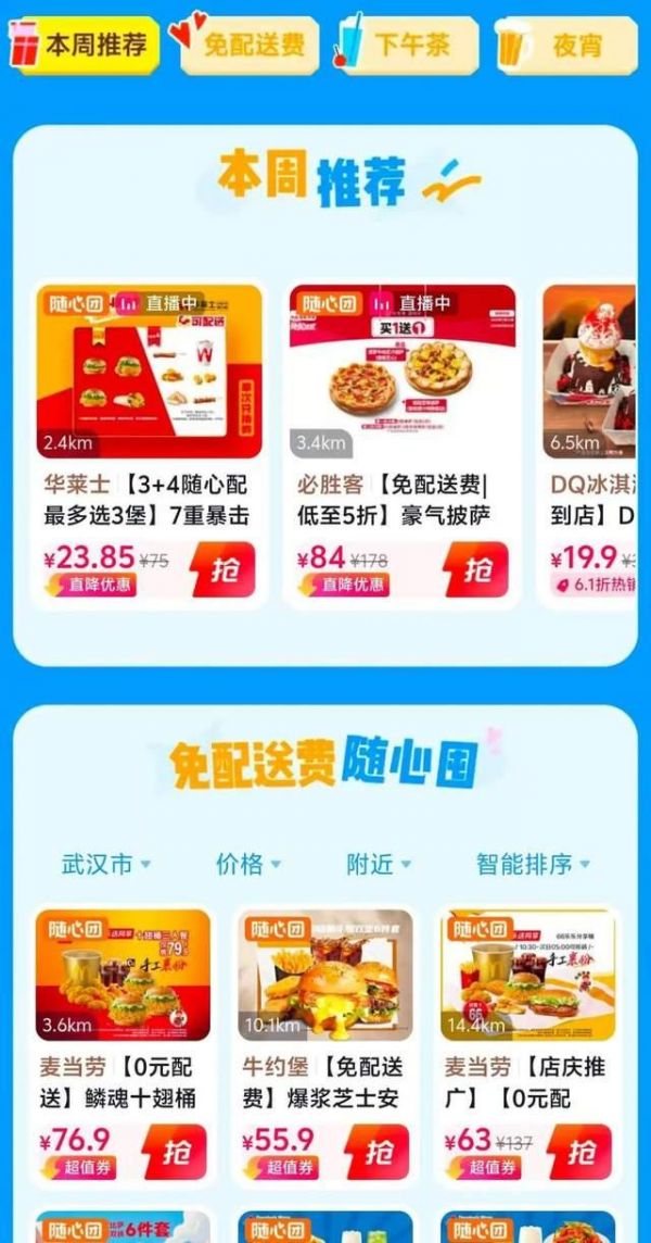 點(diǎn)擊“搶購”,會(huì)進(jìn)入到“隨心團(tuán)”頁面。頁面內(nèi)除了顯示本周推薦的活動(dòng)商品,還有下午茶、夜宵等分類下的商品,部分商品支持免費(fèi)配送。