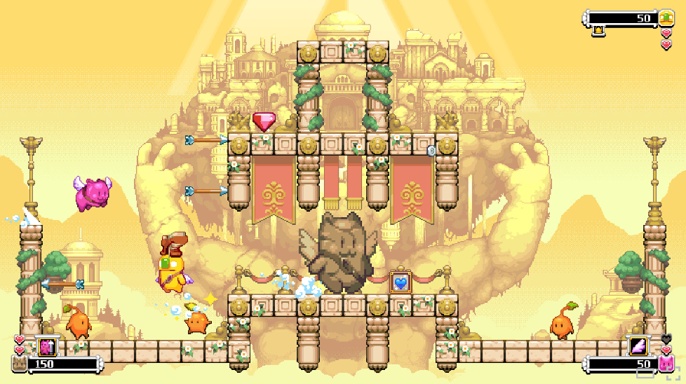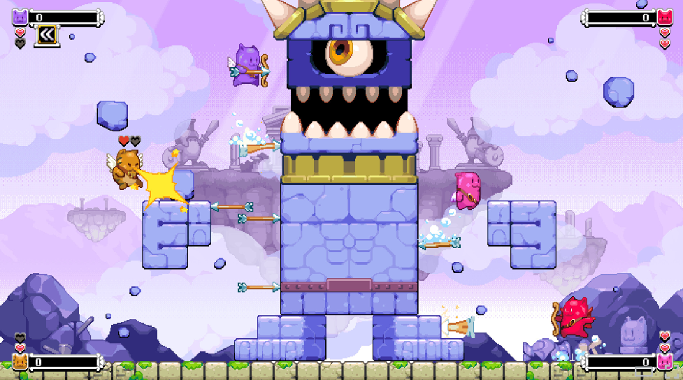 這是一款街機(jī)風(fēng)平臺跳躍射擊游戲,你將化身天使貓貓,拿起弓箭守護(hù)家園。