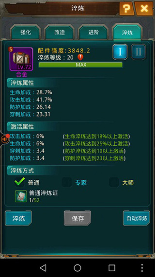 重點來了,到了20級之后,你就要開始用金幣去淬煉了,但低戰玩家原本就缺金幣,所以你要學會用金幣淬煉劵去淬煉,淬煉也是要有時間去淬煉的,大概淬煉時間段在晚上6點到7點半最好,中午這段時間別淬煉,個人感覺那不是個好時段。回歸整體,該怎樣用金幣代用券去淬煉呢?先用普通資源硅,點3下或者4下,看一下滿級后的淬煉屬性波動,究竟大不大?如果大,那就用金幣代用券淬煉,之后再用代金券淬煉兩到五次,也是看下波動,如果波動大那就用大師淬煉去淬煉,這時淬煉差不多就可以有好的屬性,但大師淬煉點三下就可以,點多了不劃算。如果這天你根據上述做的都覺得效果不行?那就陸續投入下去,保持每天都這樣,終有一天能淬煉到你的滿意屬性。