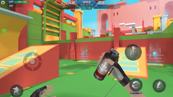游戲畫面左下角有一個圓圈狀的虛擬按鈕,右下角有個未顯示的虛擬按鈕,玩家通過滑動虛擬按鈕控制人物的動作。其中左下角的虛擬按鈕控制移動右下角的虛擬按 鈕控制準(zhǔn)星和射擊。同時,在畫面左上角設(shè)置按鈕中有戰(zhàn)績查詢、游戲設(shè)置、鍵位設(shè)置功能,左下角有蹲下按鈕,畫面右側(cè)分布有跳躍、切換武器、換子彈、扔手雷 等按鈕。