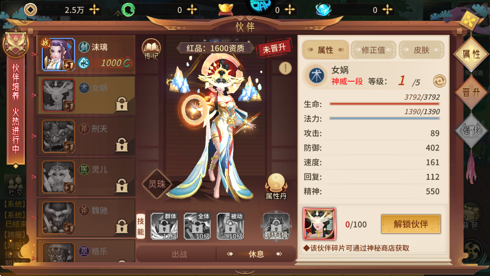 被動技能:女媧擊殺任意目標后,會引發山崩,對敵方單個目標造成精神屬性307%的法術傷害
