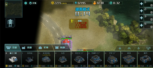 解鎖建筑:施工工地上限1,發電站,補給中心,兵營上限3,突擊車工廠上限1,船塢上限1,基礎防御塔上限2,海上防御塔上限1