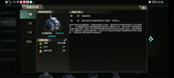 1級:提供:28資源/每分鐘,提供電力57度,提供30點指揮點數。