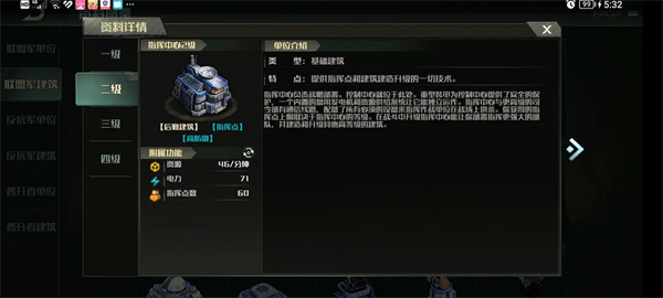 2級:提供:資源46/分鐘,71度電,60點指揮點數。