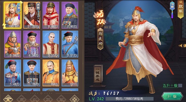 軍事升級(jí)主要是對關(guān)卡的貢獻(xiàn)。在此建議前期要偏向于商業(yè)大臣和軍事大臣,因?yàn)樯虡I(yè)提高后,征收會(huì)獲得更對的銀兩,而軍事提高后,有利于關(guān)卡戰(zhàn)斗力會(huì)相應(yīng)提高。在游戲前期盡快進(jìn)行關(guān)卡戰(zhàn)斗獲取君王經(jīng)驗(yàn),君王等級(jí)每提升一級(jí)會(huì)開啟一次科舉選取,圣上們可以選擇自己喜愛的大臣冊封狀元,大臣升級(jí)是提升國力的最快最基本的方式。