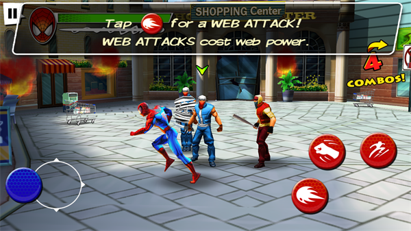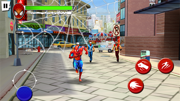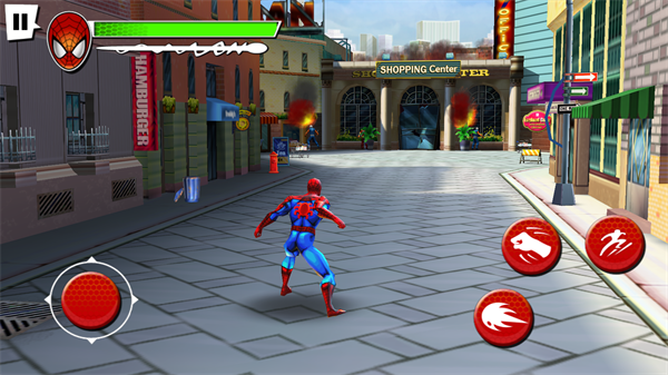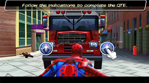 戰斗節奏緊湊,玩家可通過組合虛擬搖桿與按鍵實現快節奏連招。連擊系統鼓勵持續攻擊,積累積分可兌換蜘蛛戰衣或技能升級,同時支持QTE(快速反應事件)觸發華麗招式,提升操作爽快感。