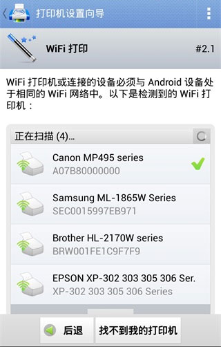 6、選擇打印機類型,附近的WiFi打印機、附近的WiFi掃描儀、附近的藍牙打印機中任意一種,這里我們選擇WiFi打印機,軟件將自動掃描周邊的WiFi打印機,點擊即可連接到打印機。