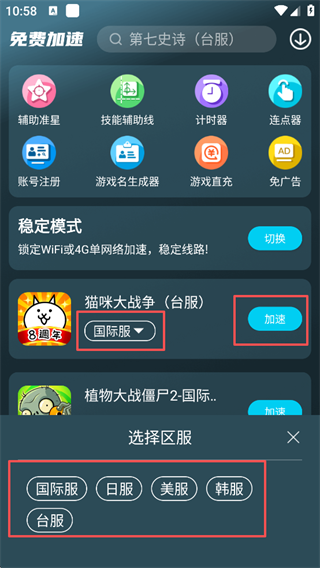 2、這上面可以看到你手機上的游戲點擊加速【有一些游戲會有特別的服比如:國際服、美服等等】